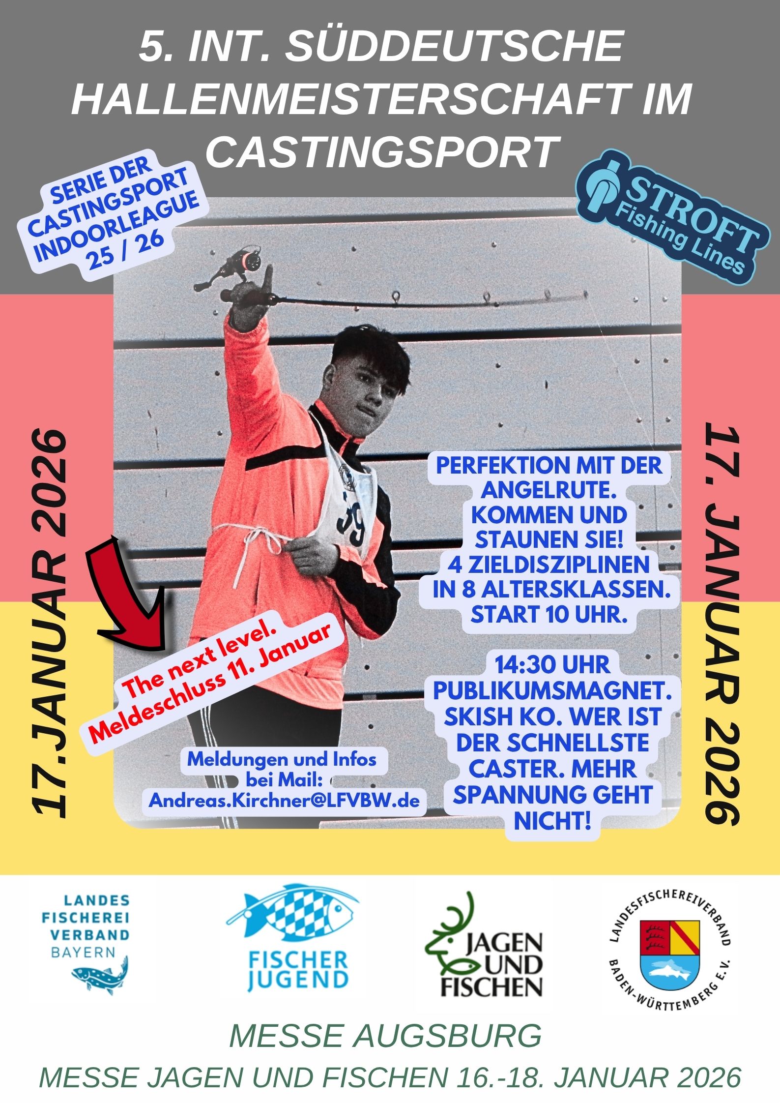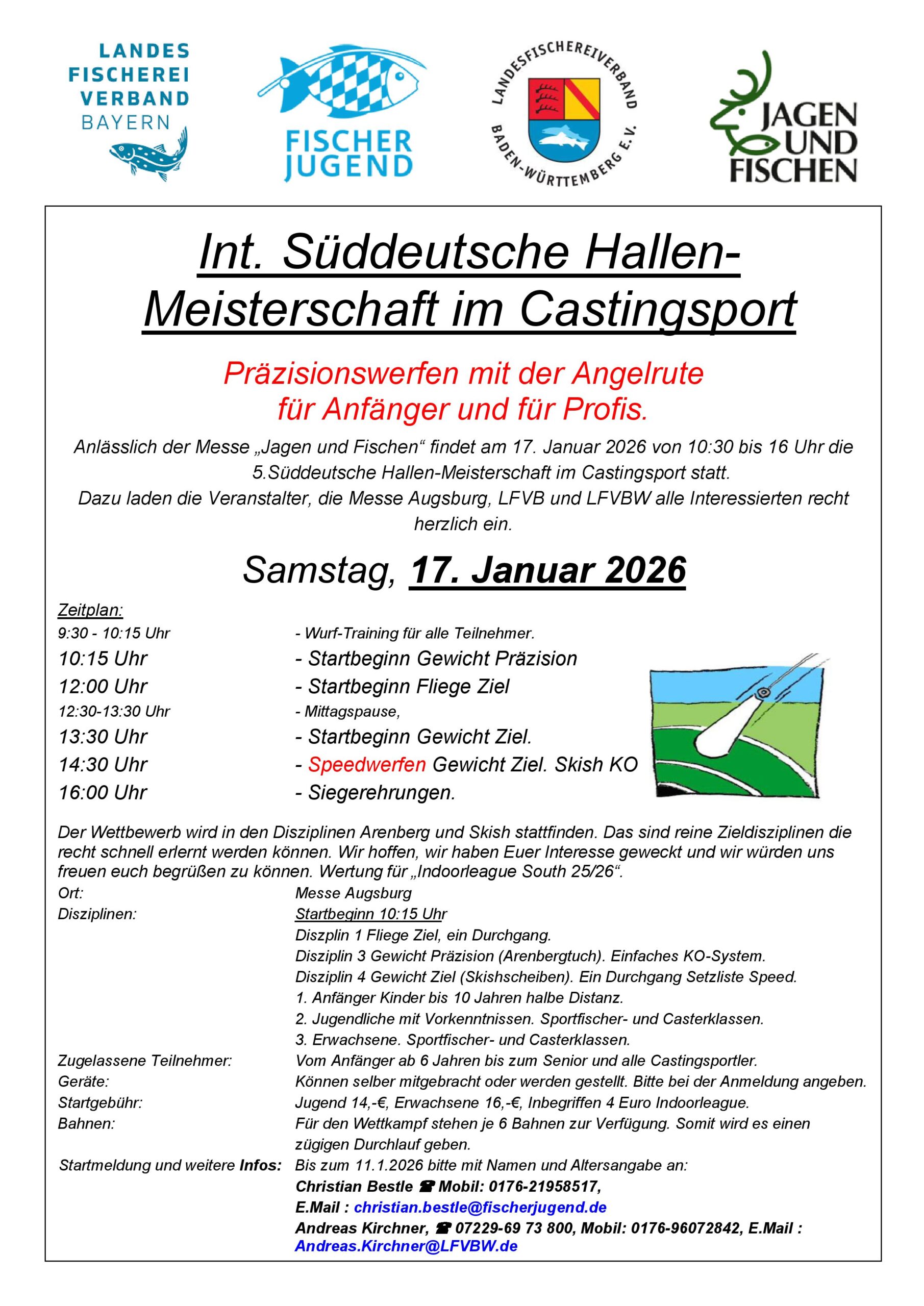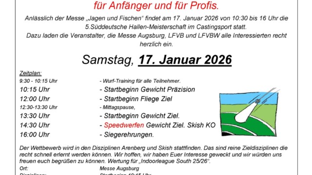 wir freuen uns, euch die neuen Plakate zur Indoorleague Castingsport 2025/26 sowie zur Süddeutschen Meisterschaft im Rahmen der Messe „Jagen und Fischen“ in Augsburg vorzustellen!