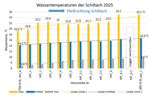 Temperatur & Beschattung: Die Messungen bestätigten einen direkten Zusammenhang zwischen fehlender Ufervegetation und kritischen Wassertemperaturen. Der Spitzenwert von 25,1 °C stellt für Salmoniden (Forellenartige) eine lebensbedrohliche Grenze dar. Hauptursache für solche Extremwerte war ein Kahlschlag am Ufer im Winter 2024 / 2025. Zudem beeinflusst die Temperatur der Schiltach messbar die der Kinzig.